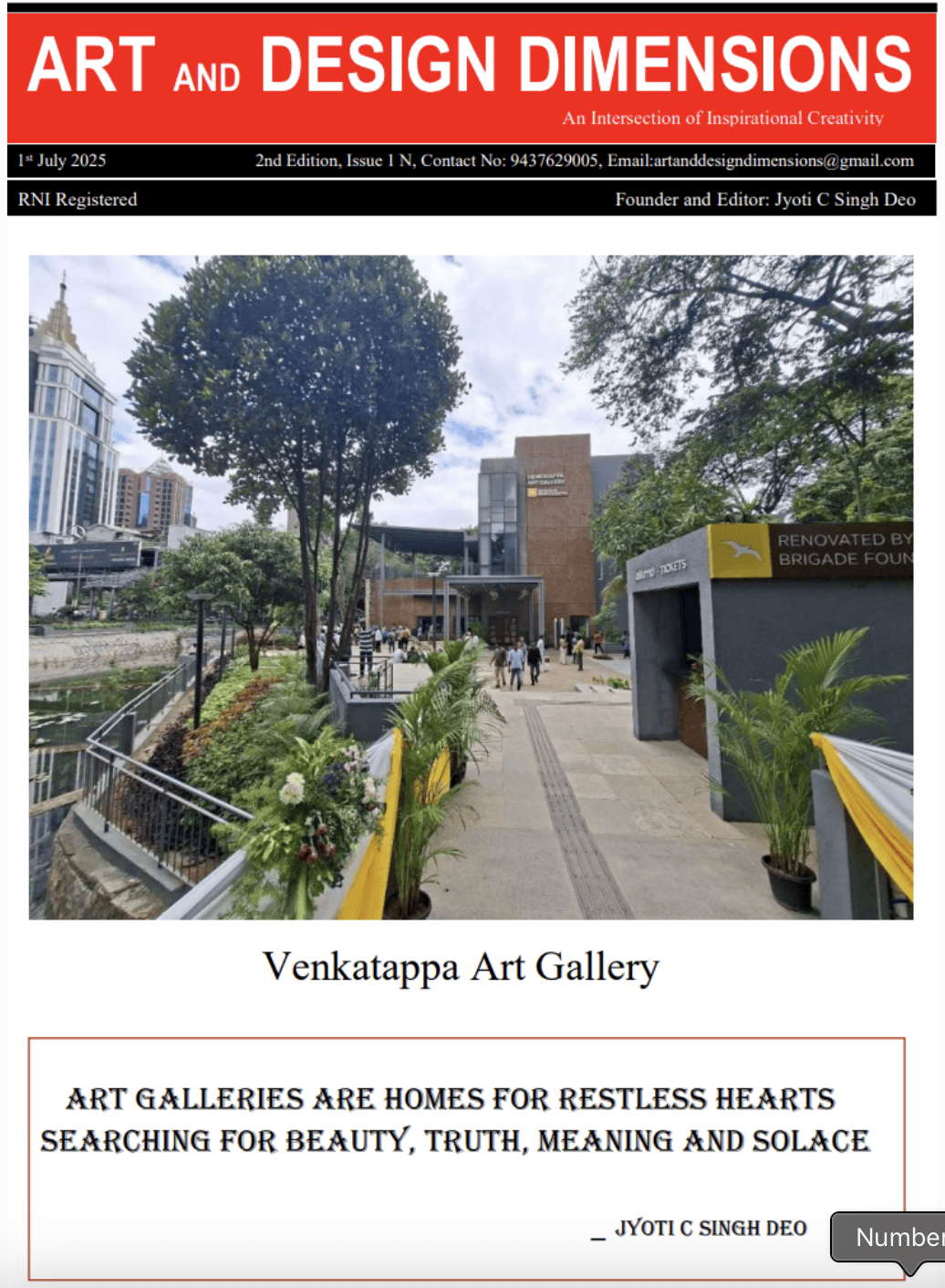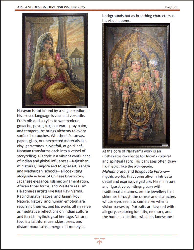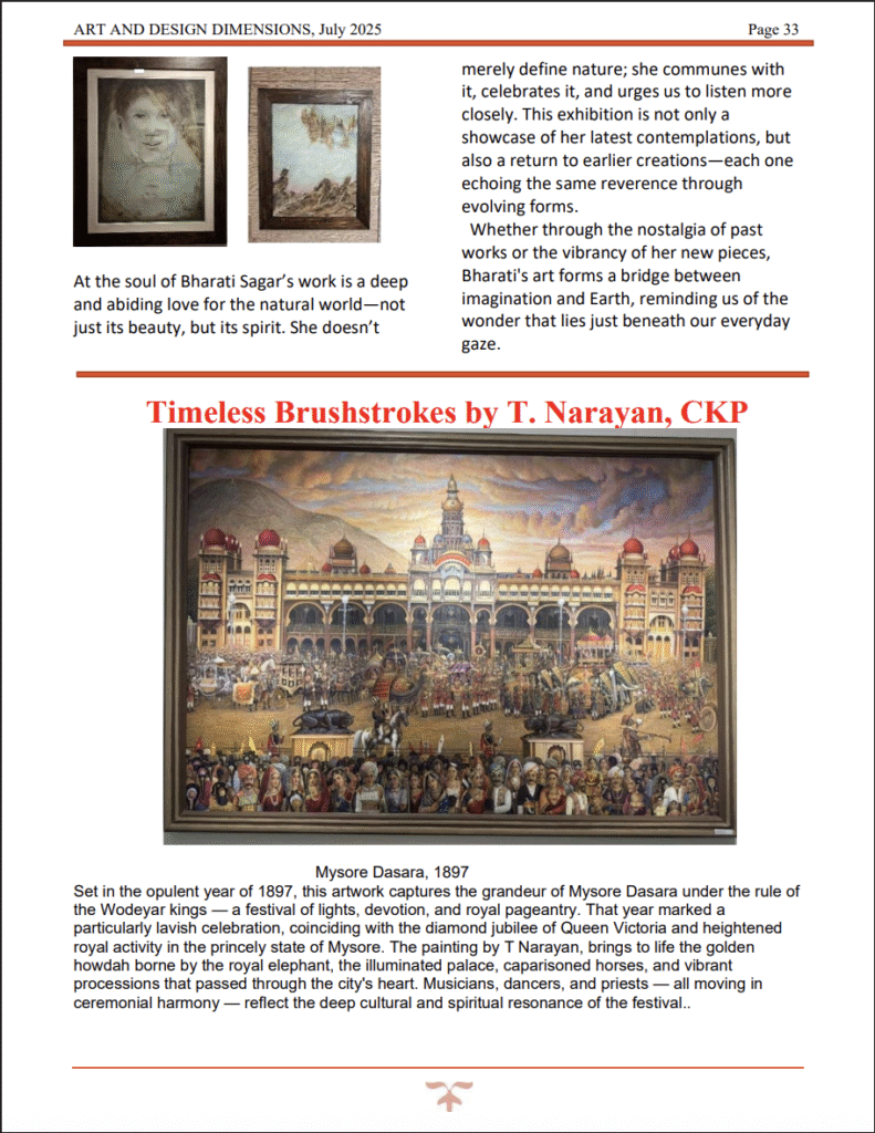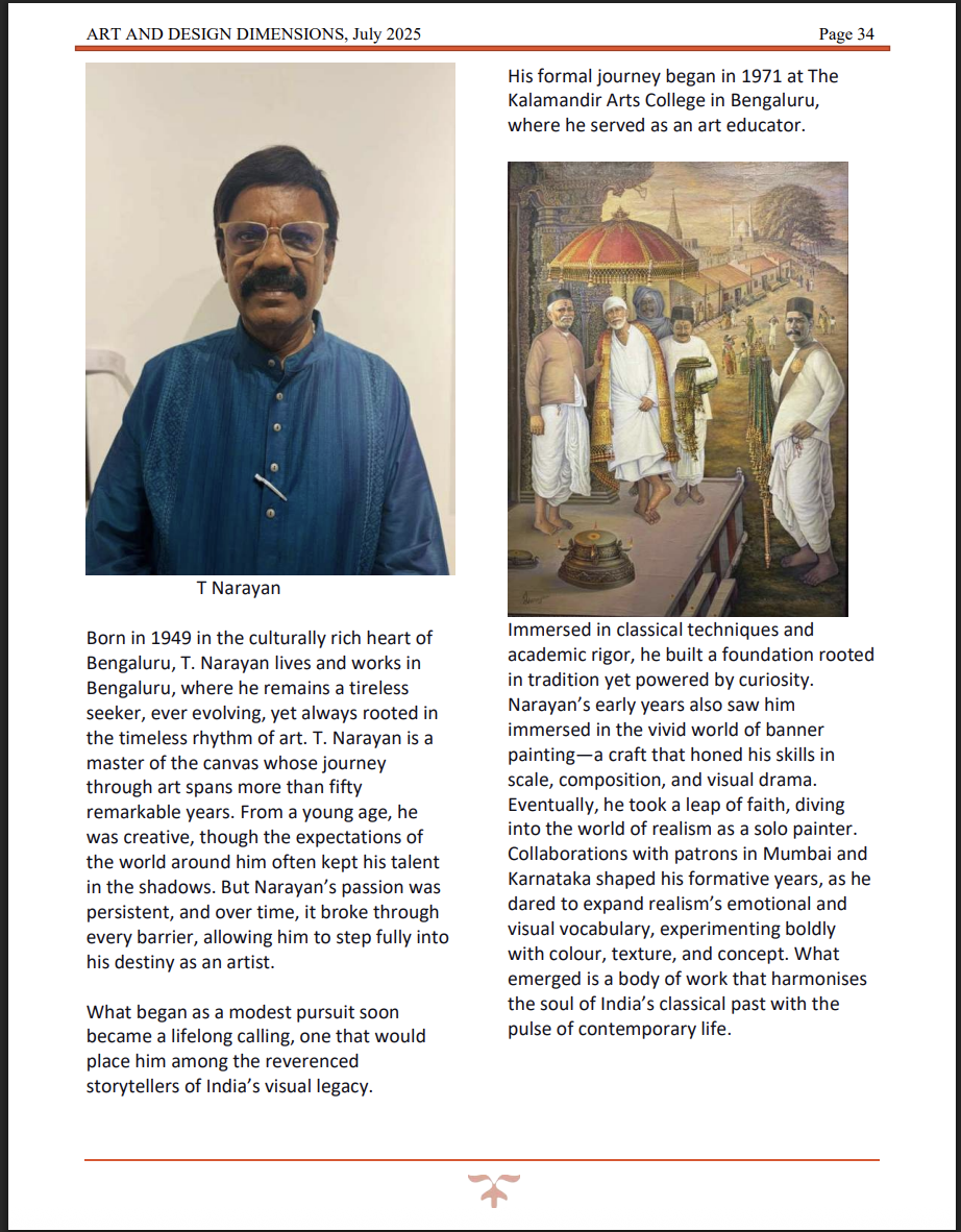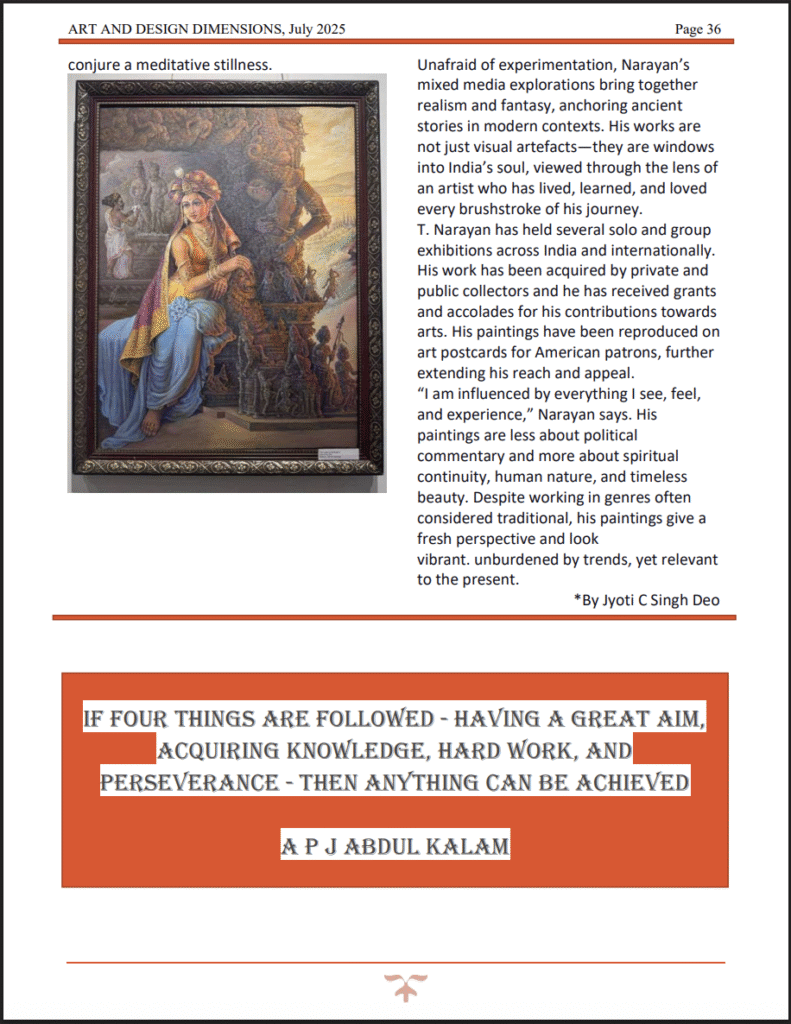 Timeless Brushstrokes by T. Narayan, CKP | “Narayan’s mastery over both traditional and contemporary art forms shines through in his latest exhibition. The online magazine praised his ability to weave history, culture, and emotion onto canvas, calling the show ‘a moving homage to India’s architectural and spiritual heritage.’ His artworks continue to inspire art lovers and collectors alike.” — Featured in Art And Design Dimensions Magazine, July 2025 |